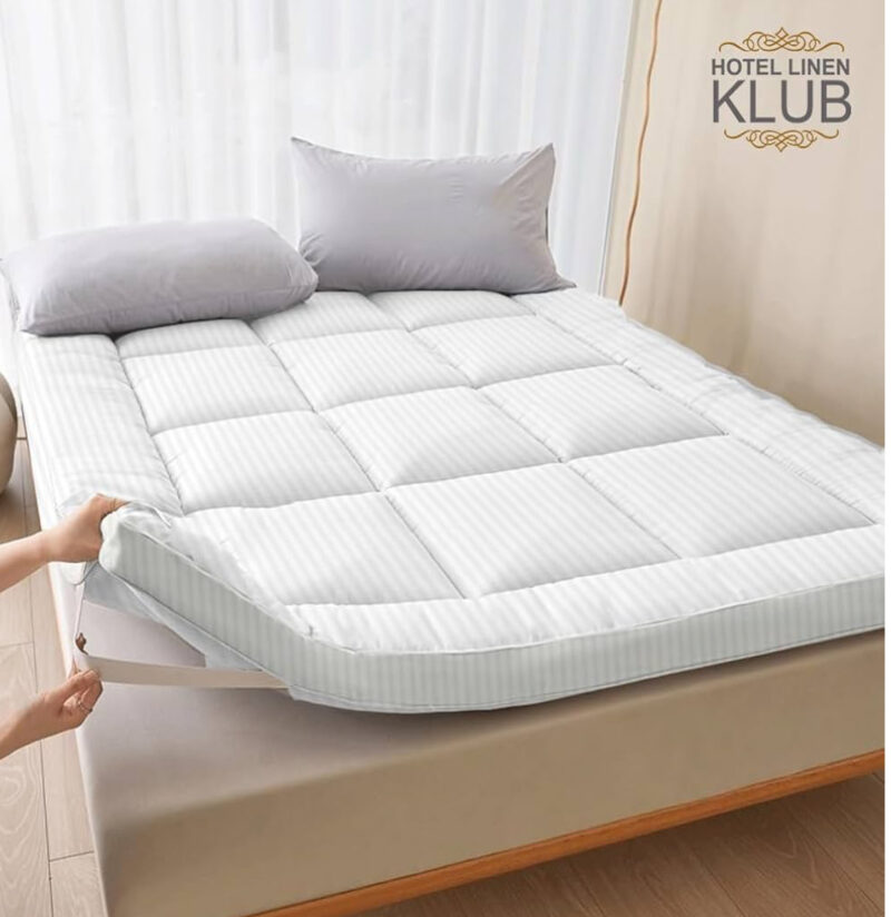 Hotel Linen Klub Queen Mattress Topper -Hotel Luxury Stripe Super Soft Fabric -700GSM Soft, Firm,and Extra Thick Fibersheet and Highly Elastic Bands,Size: 160 x 200+7cm, White