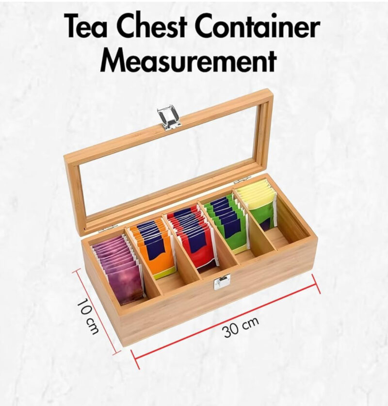 Tea Bag Organizer | Tea Storage Chest Case Wooden Tea Bag – Storage Box with Transparent Hinged Lid for Any Home Restaurant Office – Wooden Color – 5 Compartments